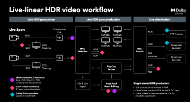 The diagrams below offer some examples of such workflows. Morizur explained that a significant effort was invested in setting up the Ultra HD production to get the HDR right. Our other article about NBCU’s Single Stream LUT-based approach explains [LINK] how the operator derives the best possible SDR quality from the HDR.