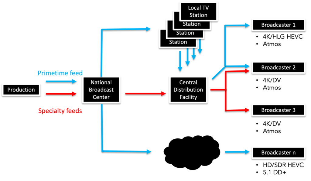 In this project with NBCU for the Olympic games, Dolby learned much with a genuinely complex workflow shown in simplified form in the diagrams below.