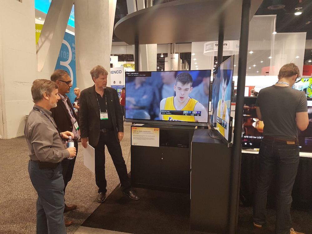 The fourth pod was focused on HDR and SDR Improvements, a demo produced by Technicolor based on the collection of technologies that they refer to as Advanced HDR (including SL-HDR1). The demo comprised a mix of HDR and SDR camera feeds where the SDR contributions were up-converted to HDR and mixed with the HDR feeds prior to transmission. The transmission HDR video was processed using Technicolor’s technologies to create an SDR feed with an additional stream of metadata that represents the tone mapping required to convert the SDR content back to HDR. This SDR feed with metadata was passed through transmission and presented to two TVs, one SDR without Technicolor’s technology and one HDR connected to an STB that included the Technicolor technology to recreate the HDR picture. The SDR based display rendered correctly the SDR video to its best capability, and the STB connected to the HDR display recreated the HDR content by reversing the SDR tone mapping.