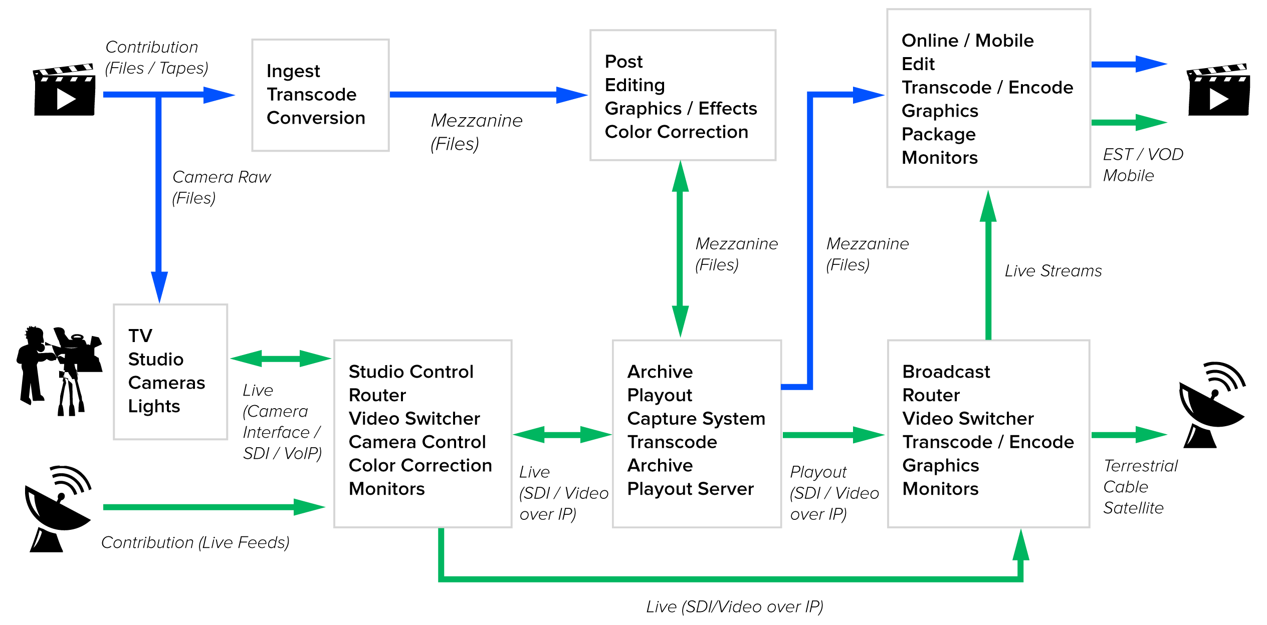 The guidelines document addresses both Pre-recorded and Live content production. Below is a generic diagram of a production system whose functions are documented in the guidelines.