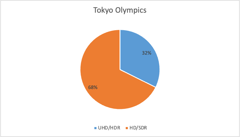 The chart below represents the amount hours of content produced by OBS during the Tokyo Olympics. By comparison, all productions by HBS at the 2022 FIFA World Cup were Ultra HD; as a reference, our service tracker currently shows that 57% of tracked (Ultra HD services offer HDR, note that the service tracker looks at the distribution side, not the production side As a reference, in the VOD world, we see 17% of large SVOD assets (Netflix, Amazon) are in HDR format.
