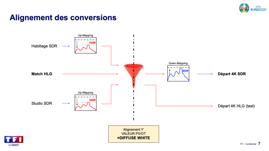 TF1 used the reference levels described in the standard (such as the 203 cd/m2 Diffuse White) for SDR to HDR conversion and HDR and SDR simulcast and to build their static LUT.