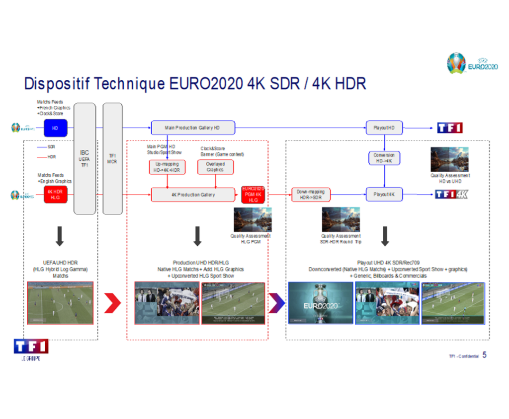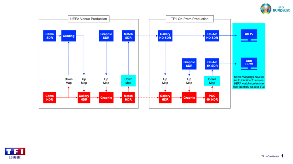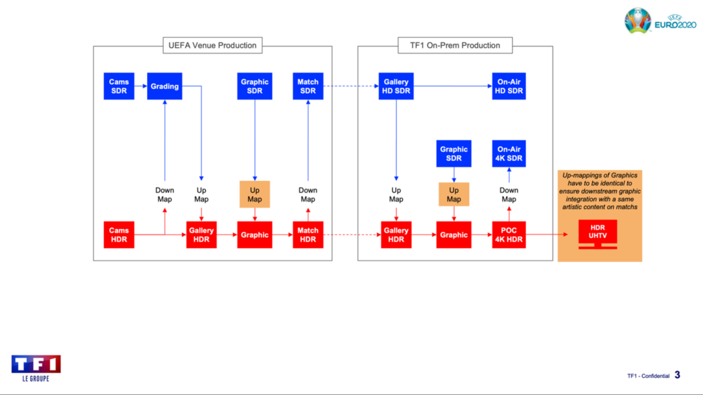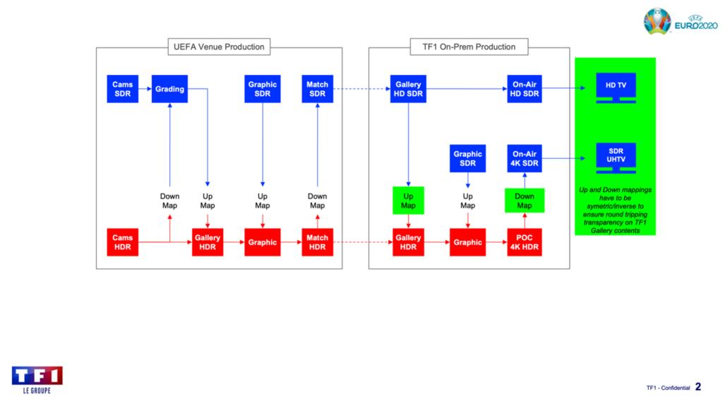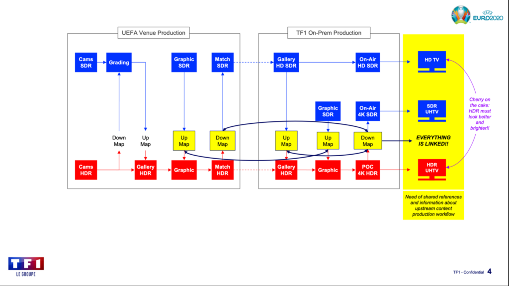 Yves Davot, Broadcast Engineering Manager at TF1, recently presented the network’s experience delivering a UHD service for Euro 2020 to the French UHD trade group FAVN, an Ultra HD Forum member. His presentation (in French) covered the technical challenges in delivering the competition in 4K over the summer of 2021. We caught up with Yves to dig a little deeper and are happy to share these learnings with the wider Ultra HD Forum community. A note of vocabulary, what we discuss here as “down-mapping” is more commonly referred to in Ultra HD Forum publications as tone mapping, and “up-mapping” is usually what the Forum calls “tone expansion”.