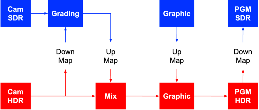 Regarding the production of the 4K SDR feed, Davot noted two other challenges. Firstly, when downscaling from the HDR feed, as above, TF1 had to make choices amongst different solutions, going in the end for a fixed LUT. The mix of SDR and HDR in both input and output resulted in some content being upconverted then down-converted back. It is critical to use the right Diffuse White level for this “round-trip”, as discussed above. In the diagram below (in French), we can see graphics are natively in SDR and converted to HDR, the soccer match is in HLG, while the studio is shots are in SDR and therefore up-converted to HDR. The resulting signal is sent to an SDR broadcast and HDR test.