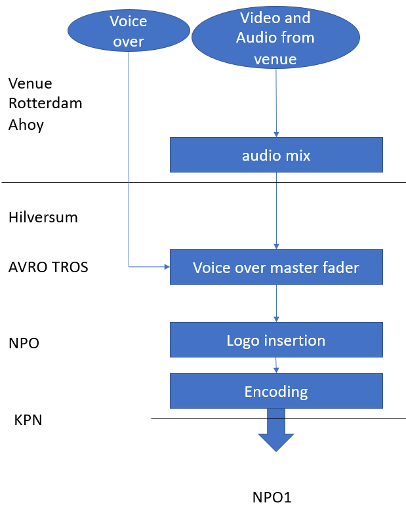 For the Netherlands, the signal is received in Hilversum by the broadcast organisation AVROTROS that produces the local program. The feed was a satellite feed that we replaced with a fibre feed during the project. AVROTROS adds titles and a live commentary from the venue.