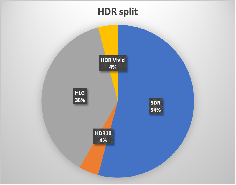 The following chart illustrates one of the pain points described in the other articles for this newsletter. On-demand platforms are now offering more and more HDR content, but it still seems a bit of a dark art for live events, and a (small) majority of operators chose to offer 4K SDR versions. One explanation is that pay-TV operators’ STBs are not all HDR-enabled. Hence, SDR, the lowest common denominator, has to be selected for a broadcast scenario. If we look at the statistics for OTT services, we see an even more significant gap with 75% of the services in SDR and only 25% in HDR. In an OTT environment, we would have thought that operators could offer SDR and HDR feeds, but due to the complexity and the cost, like for pay-TV, OTT operators are not widely supporting HDR.